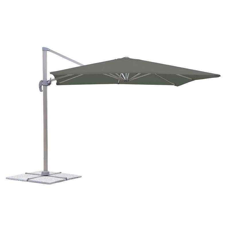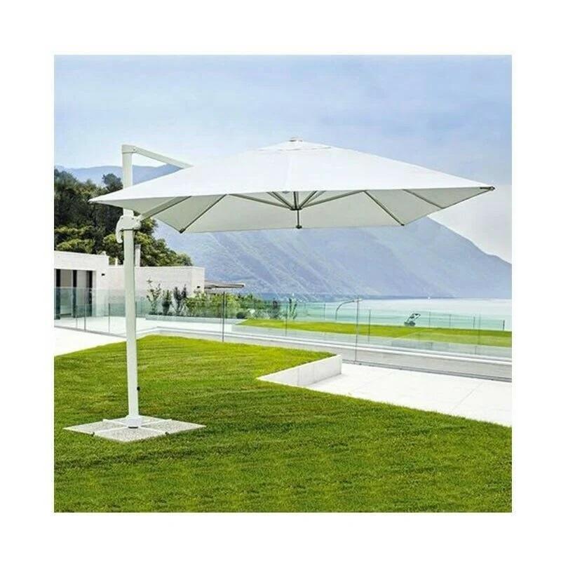 Ombrellone a braccio, reclinabile con struttura in alluminio e copertura in poliestere da 280 gr/mq impermeabilizzato. 8 stecche, cuspide antivento. 360° rotazione. Base a croce. Disponibile nella versione quadrata da m 3×3. Tre le varianti di colore proposte: ecru’, bianco e grigio. Vista la dimensione e il peso notevole dell’ombrellone, si raccomanda l’uso di piastre di cemento per il basamento. Confezione: scatola in cartone